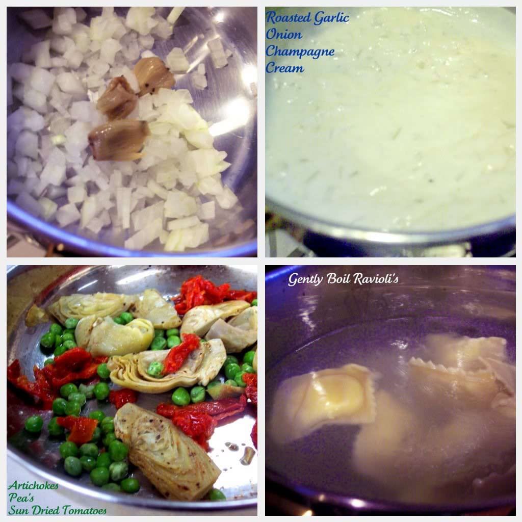 Back to the recipe. Normally we eat our ravioli with a basil and garlic flavored marinara sauce, but for a elegant way of serving them you have to try my roasted garlic champagne cream sauce. It’s not something you have everyday, but for a special occasion it’s the perfect dish, and besides you’ll have plenty of leftover champagne to sip while your eating. Don’t worry, you certainly don’t have to make your own homemade ravioli for this, you can use any good store bought kind that you like.
