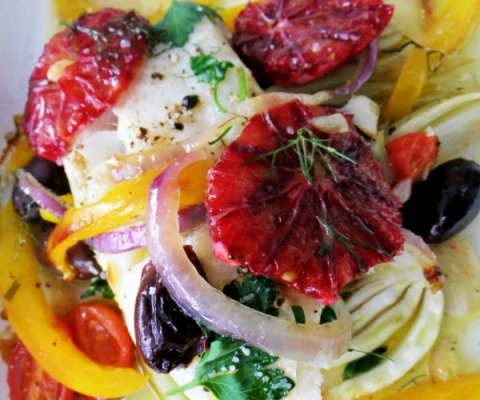 Baked Cod with Blood Orange, Fennel and Olives