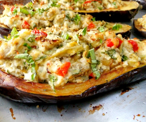 Stuffed Eggplant with Ricotta, Spinach and Artichoke