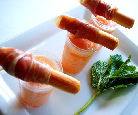 Cantaloupe Puree with Prosciutto-Wrapped Bread Sticks