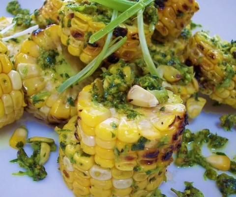 Grilled Mini Corn Cobs w/ Cilantro Pistachio Pesto