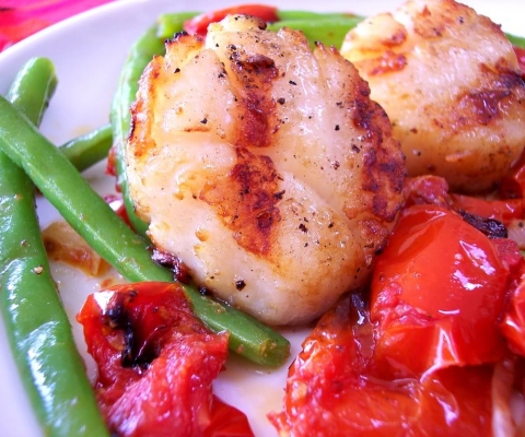 Grilled Scallops with Roasted Tomatoes and French Beans!