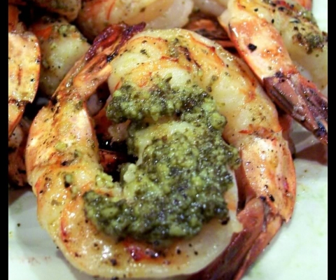 GRILLED PESTO SHRIMP WITH ROASTED TOMATO SPAGHETTI