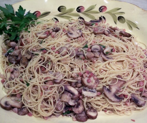 SPAGHETTI WITH PANCETTA AND MUSHROOMS
